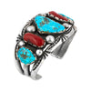 Sterling silver bracelet set with Morenci turquoise and Mediterranean coral by Dan Simplicio. Measures 5 1/2" with a 1 1/2" opening, 1 11/16" width.