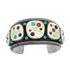 Sterling silver tufa cast bracelet inlaid with fossil ivory, turquoise, coral, lapis, sugilite and 14k gold accents by Boyd Tsosie. Measures 5 13/16" with a 1 1/4" opening. 1 1/2" width.