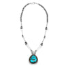 Sterling silver necklace with beautiful handmade beads and set with Lone Mountain turquoise by Mary Marie Lincoln. Measures 20 1/2". Shadow box pendant measures 2" x 1 3/8".