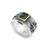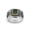 Darryl Dean Begay sterling silver tufa cast ring set with high grade Apache Blue turquoise in a gold bezel. Size 10 1/2. 1/2" width.