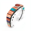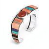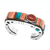 Sterling silver bracelet inlaid with Mediterranean coral, turquoise, lapis, sugilite, and ironwood by Wes Willie. Measures 5 1/4" with a 1" opening. 3/4" width.