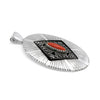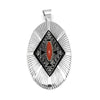 Sterling silver shadow box pendant with fine stamp and chisel work set with Mediterranean coral by Richard Tsosie. Measures 3 3/16" x 1 7/8". 3/4" bale.