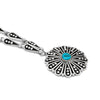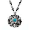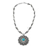 Sterling silver necklace set with high grade Morenci turquoise by Johnathan Nez. Measures 19". Pendant measures 2" in diameter.