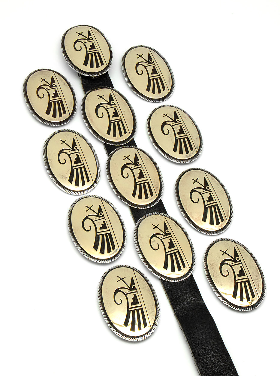 A fabulous 14k gold over sterling silver concho belt by Victor Coochwytewa. Buckles and conchos measure 2 1/4" x 1 1/2".