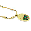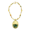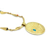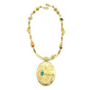 This fabulous 18k gold tufa cast reversible necklace by Darryl Dean Begay is inlaid with high grade materials of Carico Lake turquoise, sugilite, coral, and Australian opal. The reversible pendant features Taos Sacred Mountain with stars on one side and a Robert Mirabel pueblo scene on the other. Necklace measures 18". Pendant measures 3" x 1 15/16" including bale.